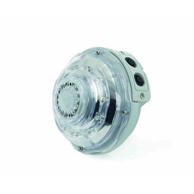 Spot lumineux pour Pure Spa Intex équipés de Jets. Eclairez votre spa gonflable avec cette lampe à LED multicolore pour prolonger votre baignade même la nuit. Créez une ambiance unique pour vous détendre. Cette spot s’illumine de 5 couleurs différentes : blanc, vert, turquoise, bleu et violet et vous pouvez choisir deux modes d’éclairage : – 1 couleur unique fixe au choix : blanc, vert, turquoise, bleu et violet – Ou alors un changement aléatoire : vert, turquoise, bleu et violet Cette lumière se connecte sur une buse jets de votre spa et fonctionne ainsi sur le principe de la dynamo sans piles ! Il ne fonctionne donc que sur les spas à Jet ou les spas Jets+Bulles. Cet accessoires est incompatible avec les spas à Bulles uniquement (Beige ou Bleu Nuit)